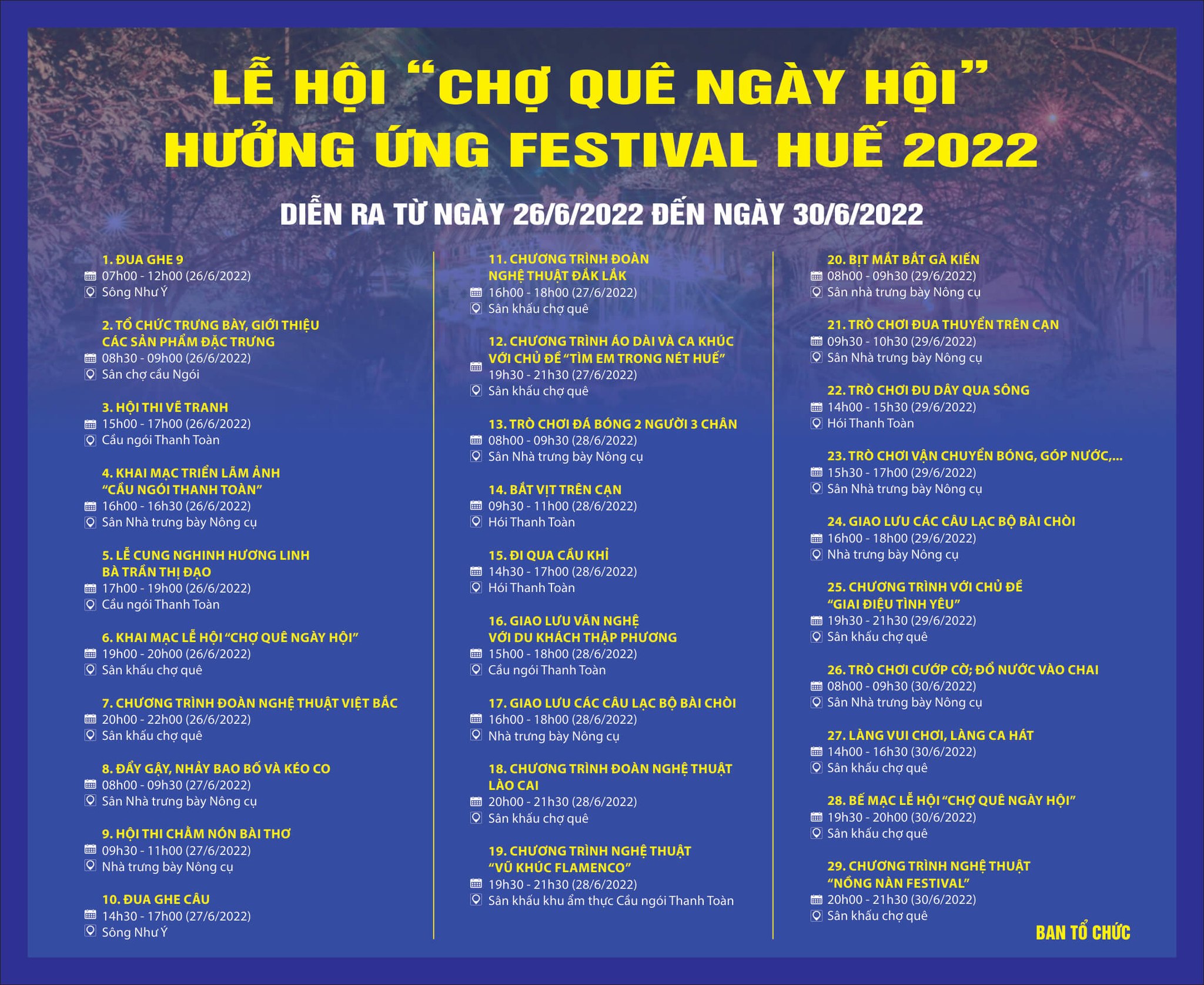 “Chợ quê ngày hội” tại Festival Huế 2022 - luôn là một trong những hoạt động hưởng ứng tiêu biểu tại các kỳ Festival Huế - sẽ được khai mạc tối ngày 26/06 và kéo dài đến 30/06 tại xã Thủy Thanh, Hương Thủy, Thừa Thiên - Huế. Đây là một điểm đến trải nghiệm mang đậm "hồn quê” với nhiều hoạt động sôi nổi.